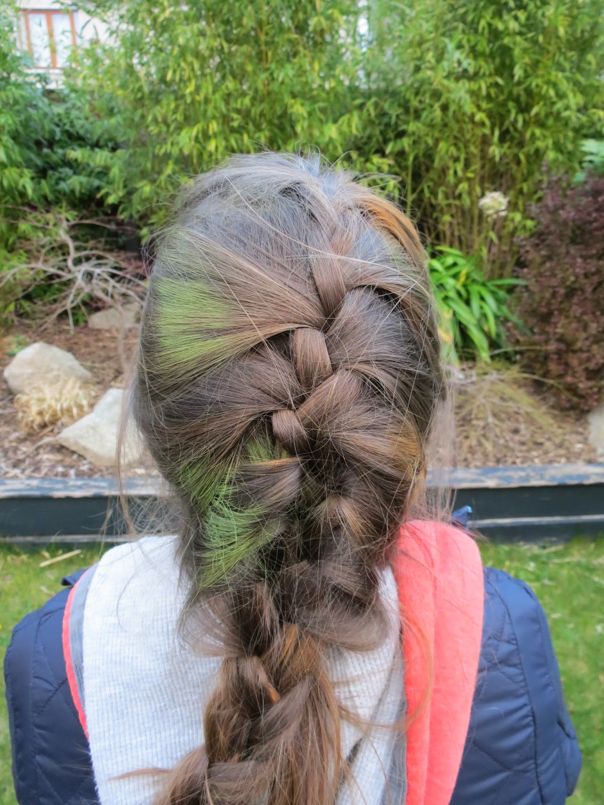 My friends' attempt of making my French plait look cool with green and orange colours... It's actually not that bad (they made me think it was worse by giggling!), as they did run out of the Claire's hairsprays during the makeover. I think little random splashes of green and orange in my hair did look cool, so thanks guys ;)